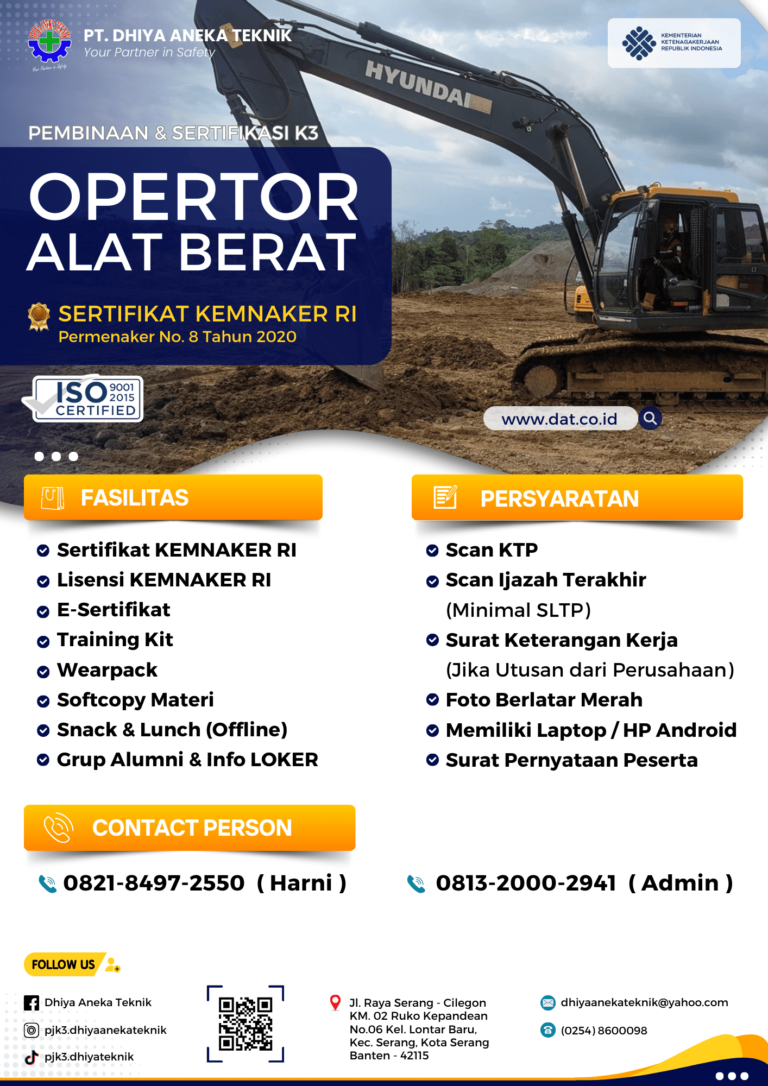 Pelatihan Operator Alat Berat (Excavator / Excavator Grapple / Buldozer / Wheel loader / Stacker Reclaimer / Grader / Loader / Pneumatic Tire Roller /Tracktor / Vibrator Roller) untuk memberikan pengetahuan dan pembinaan untuk Calon Ahli K3 Umum sesuai dengan Peraturan Menteri Tenaga Kerja Nomor PER.02/MEN/1992 Tahun 1992 Tentang Tata Cara Penunjukan Kewajiban dan Wewenang Ahli Keselamatan dan Kesehatan Kerja