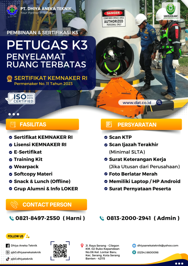Pelatihan Petugas K3 Penyelamat Ruang Terbatas bertujuan untuk memberikan pengetahuan dan pembinaan untuk Calon Ahli K3 Umum sesuai dengan Peraturan Menteri Tenaga Kerja Nomor PER.02/MEN/1992 Tahun 1992 Tentang Tata Cara Penunjukan Kewajiban dan Wewenang Ahli Keselamatan dan Kesehatan Kerja