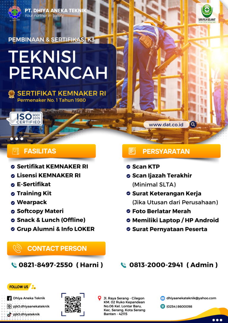 Pelatihan Teknisi K3 Perancah / Scaffolder bertujuan untuk memberikan pengetahuan dan pembinaan untuk Calon Ahli K3 Umum sesuai dengan Peraturan Menteri Tenaga Kerja Nomor PER.02/MEN/1992 Tahun 1992 Tentang Tata Cara Penunjukan Kewajiban dan Wewenang Ahli Keselamatan dan Kesehatan Kerja